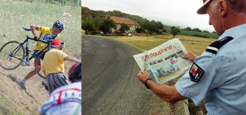 Es sind Bilder, die um die Welt gingen. Am 14. Juli 2003, unter sengender Sonne und auf glühendem Asphalt, rasen Joseba Beloki (Zweiter in der Gesamtwertung) und Lance Armstrong (Gelbes Trikot) dem Ziel entgegen. Der Kasache Alexandre Vinokourov ist auf der Verfolgung.