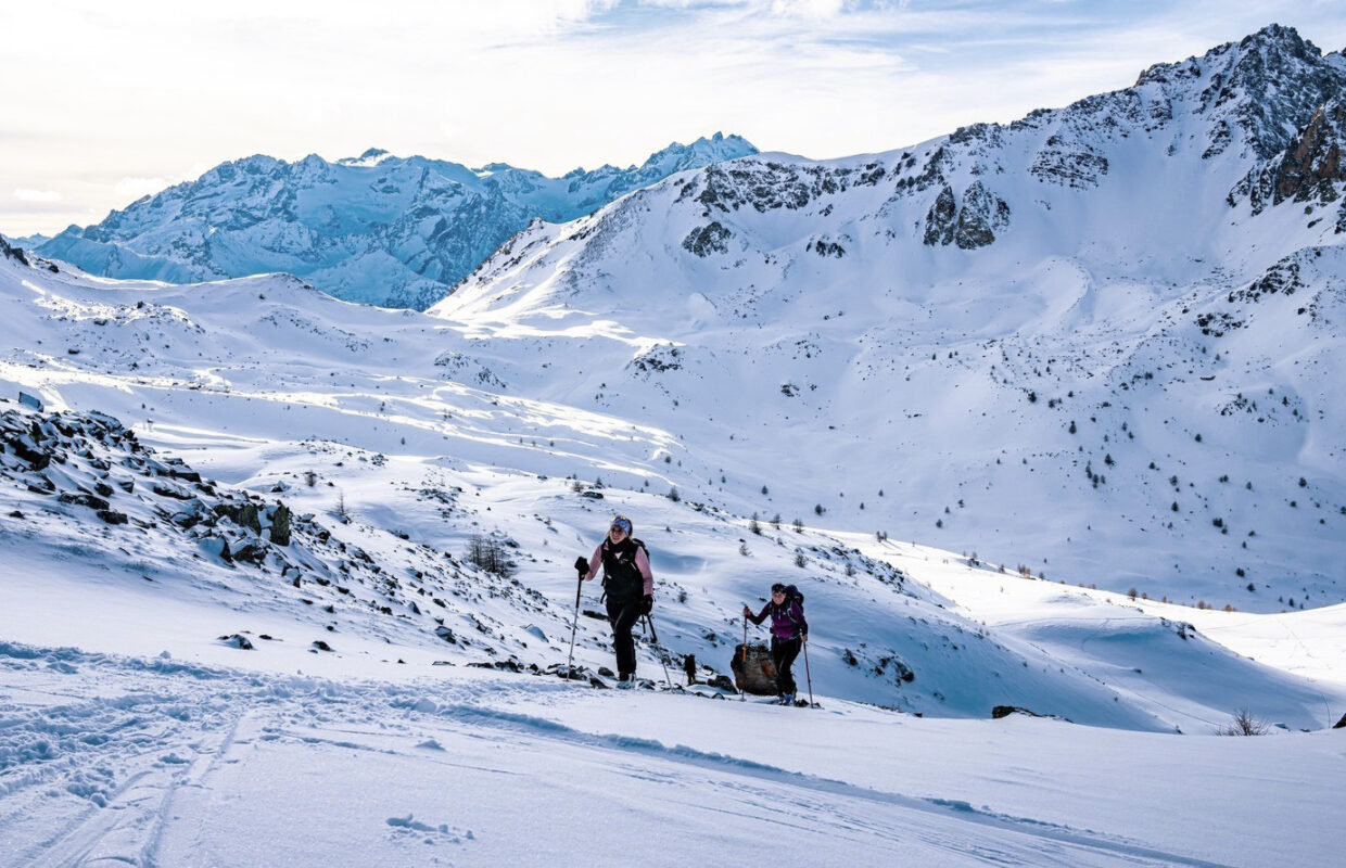 From Névache, we glide gently over the still-sleepy valley. The roofs gradually disappear behind the snow-covered larches. The climb is steady, ideal for finding your rhythm and soaking up the winter atmosphere. The valley fades away, white and silent. On arrival, the Buffère refuge stands out against the snow, facing the summits. The first night at altitude is a calm one, punctuated by the clear cold and the light of the pure Hautes-Alpes sky.