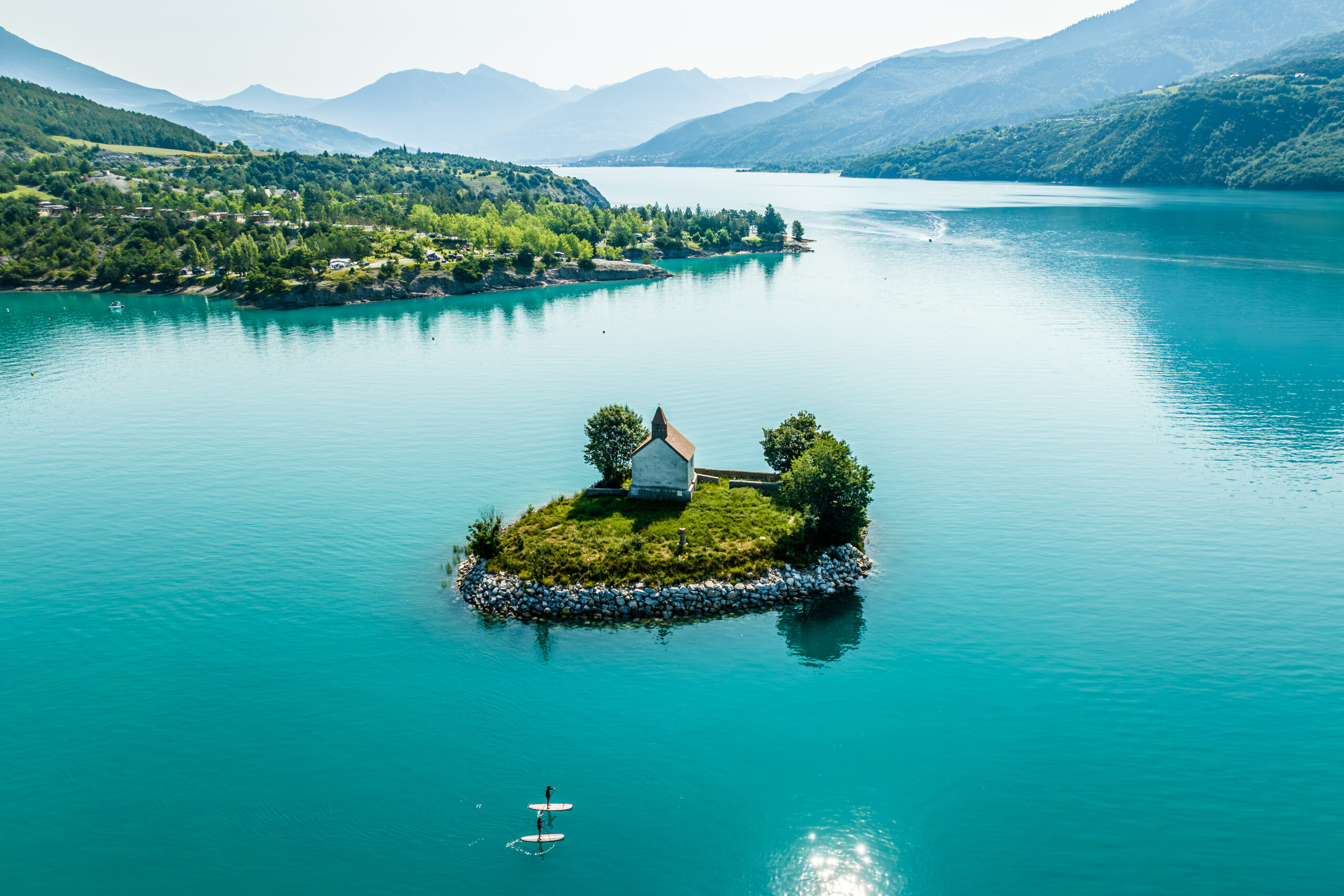 The path winds along a balcony above the majestic Lac de Serre-Ponçon. Fragrant pines and peaceful coves accompany the journey. The blue of the sky merges with that of the water. The distant mountains frame this peaceful landscape.