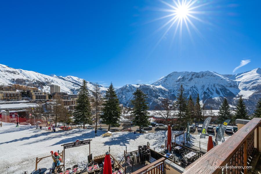 Balcon avec mobilier (2 chaises et 1 parasol) et vue sur les pistes.