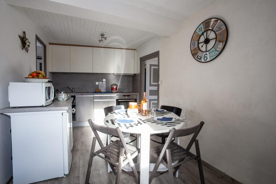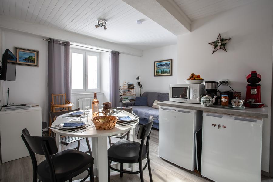 Il dispose d'un séjour/salon (télévision- WIFI), coin cuisine bien équipée (lave vaisselle, four, plaque, micro-ondes, cafetières…