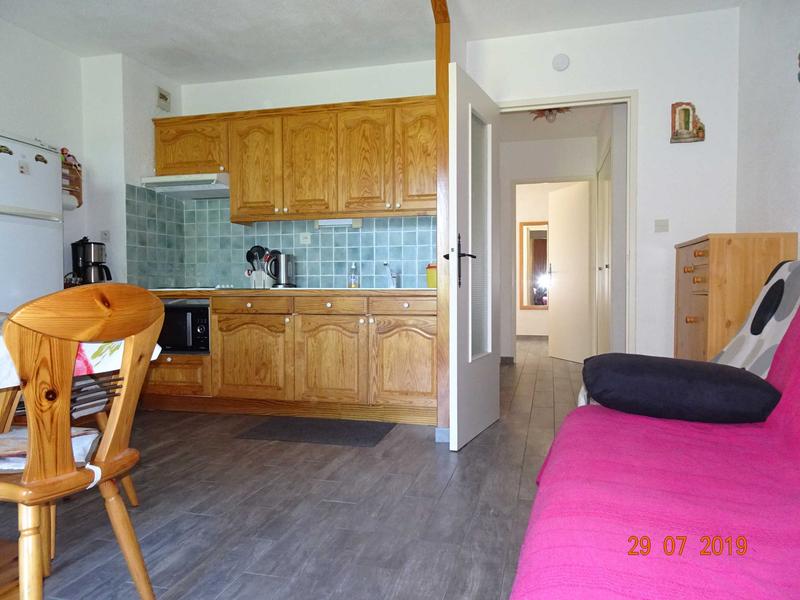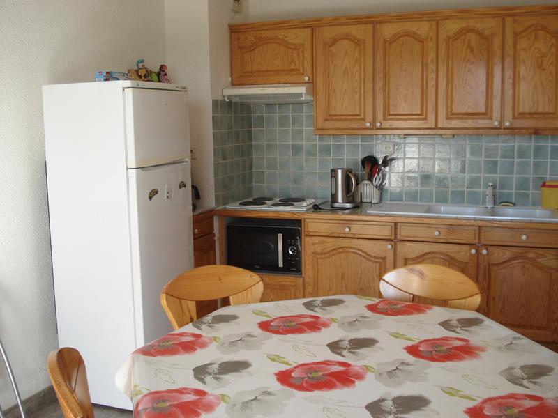 Le salon-salle à manger comprend un canapé clic-clac, deux fauteuils, télévision et lecteur DVD. Le coin cuisine est entièrement équipé (sauf lave-vaisselle).