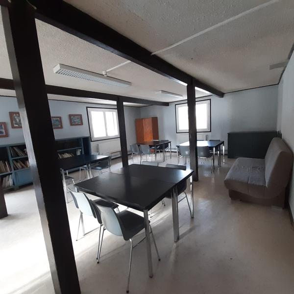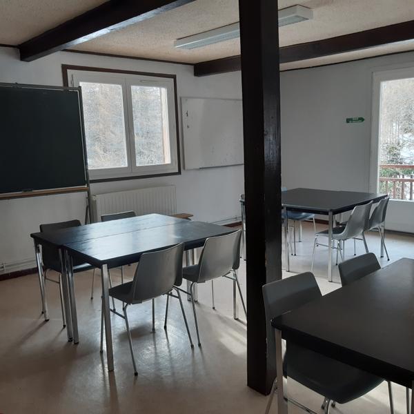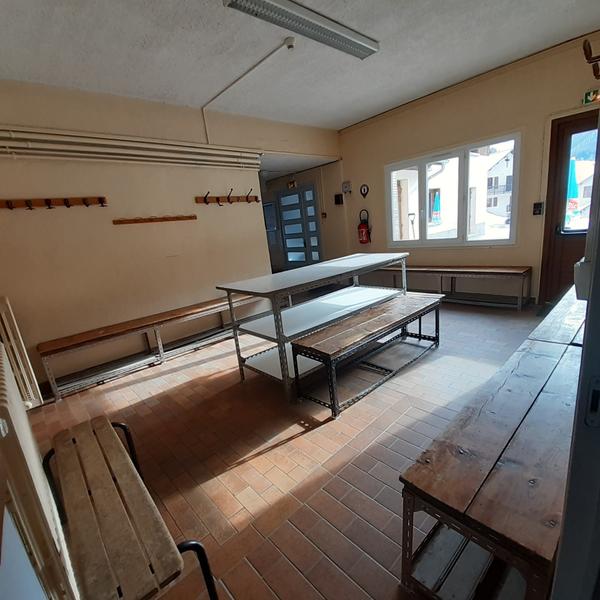 Une salle de classe et une pièce de vestiaire au rdc avec porte manteaux et bancs pour chaussures de ski.