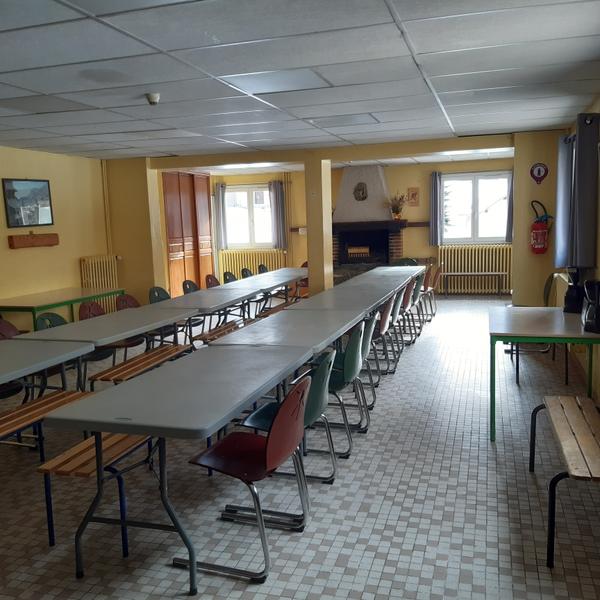La cuisine est équipée pour les collectivités, le réfectoire donne sur une cheminée avec foyer ouvert.