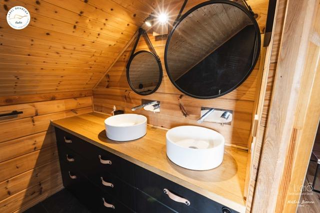- grande salle-de-bain refaite à neuf avec douche à l'italienne, baignoire, sèche serviette, double vasque et lave-linge séchant