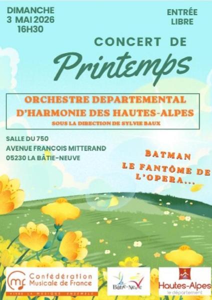 Concert de printemps de l'Orchestre Départemental d'Harmonie des Hautes-Alpes, sous la direction de Sylvie Baux, avec des musiques de Batman et Le Fantôme de l'Opéra.