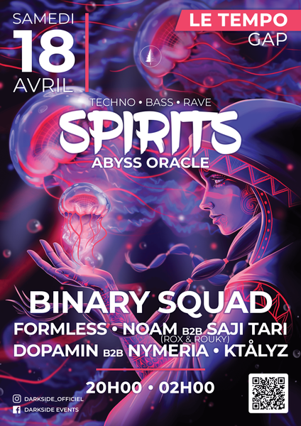 Préparez-vous pour l'immersion avec un line-up éclectique et des artistes bouillants pour vous plonger dans l’ambiance de cette soirée mystique : Binary Squad, Noam, Saji Tari, et bien sûr le Darkside Crew !