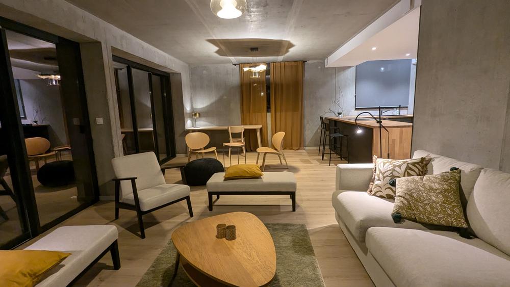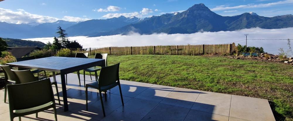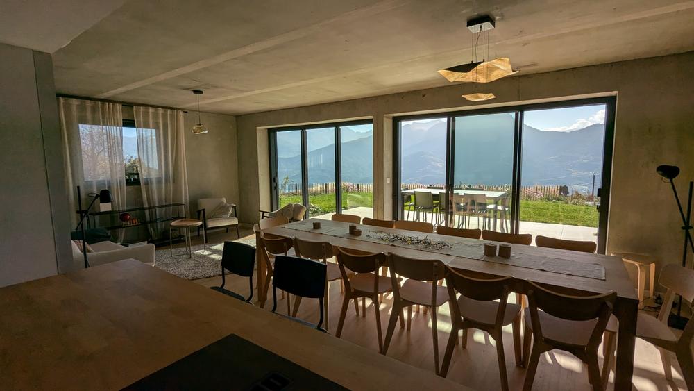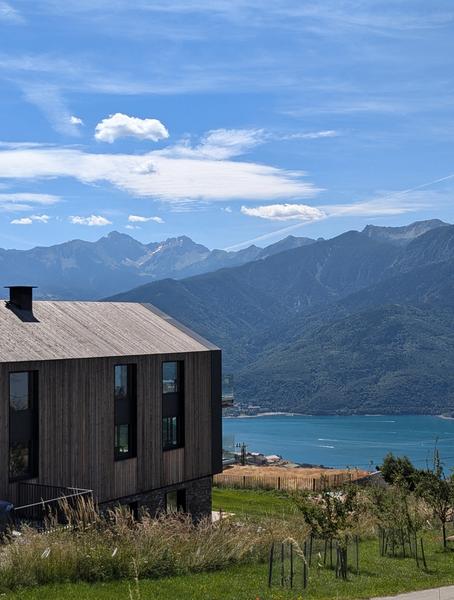 - A chaque étage : living avec cuisine équipée, disposant d'une large baie vitrée donnant sur une terrasse privative plein sud (rez) ou balcon (1er), avec vue sur les montagnes et le lac de Serre-Ponçon ;