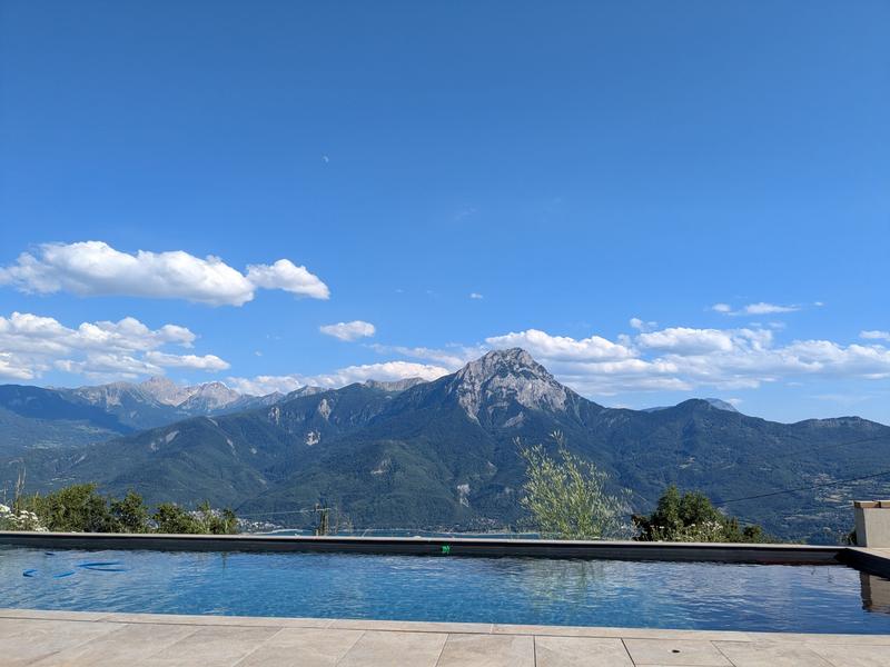 - de début juin à fin septembre, accès direct à la piscine chauffée (partagée avec le studio) avec vue sur le lac (bassin de nage : sans sel, ni chlore, ni autre produit chimique).