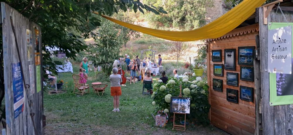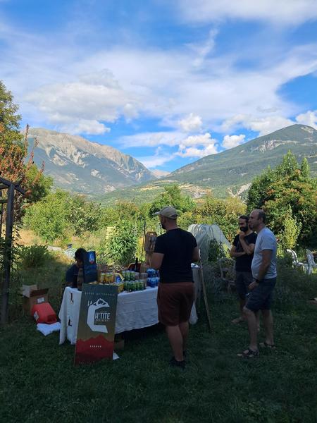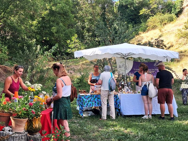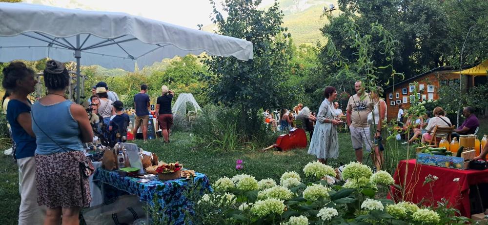 Un petit marché de producteurs locaux dans un jardin ombragé sous le Roc d'Embrun.