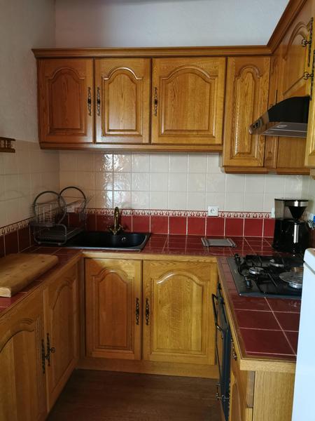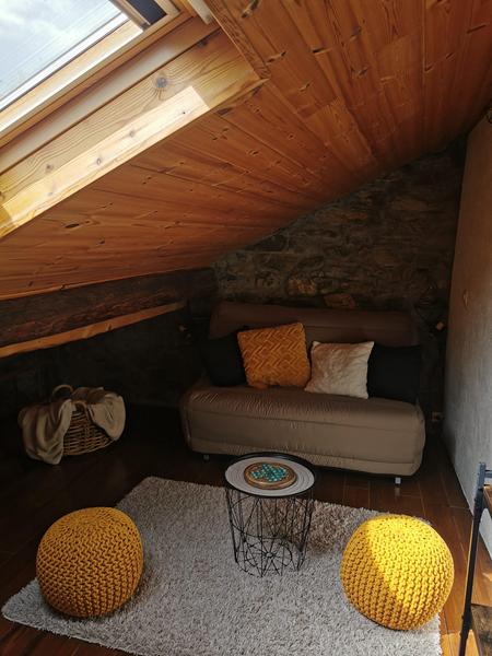 Quelques marches et tu arrives sur une grande terrasse avec salon de jardin, barbecue, transats, table et chaises. Puis tu rentres dans la pièce à vivre avec cuisine toute équipée (four, micro-ondes, cafetière filtre et Tassimo), coin repas, grand canapé.