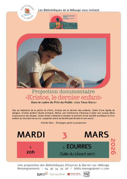Le Prix du public des Yeux docs est un festival national, auquel les Bibliothèques de la Méouge participent avec le soutien de la Bibliothèque Départementale des Hautes-Alpes. Plus d'informations : https://pro.bpi.fr/dossier/prix-du-public-les-yeux-doc-2026/