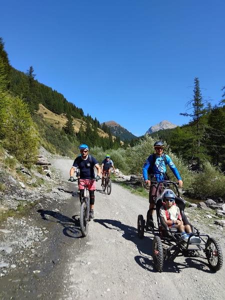 Nous sommes équipé d'un fauteuil tout terrain de descente spécialement conçu pour les personnes en situation de handicap. installe toi dans le fauteuil et laisse toi piloter par un moniteur.