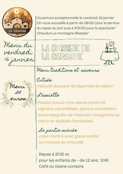 Venez découvrir ou revoir ce magnifique spectacle dans un lieu unique ' le Tiers-Lieux de La Baraque ' à Rabou après avoir déguster un bon repas préparé avec soin, avec des produits frais et de saison.