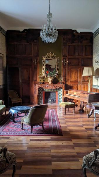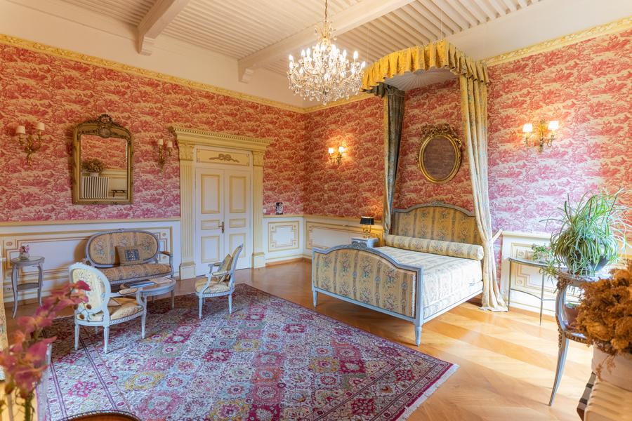 Chambre lumineuse orientée Ouest dans une ambiance Directoire. La châtelaine y accouchait, et pouvait actionner une cloche située sur le palier, depuis son lit.