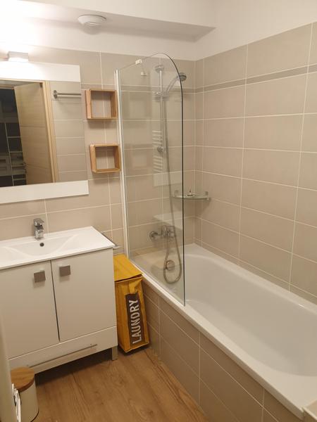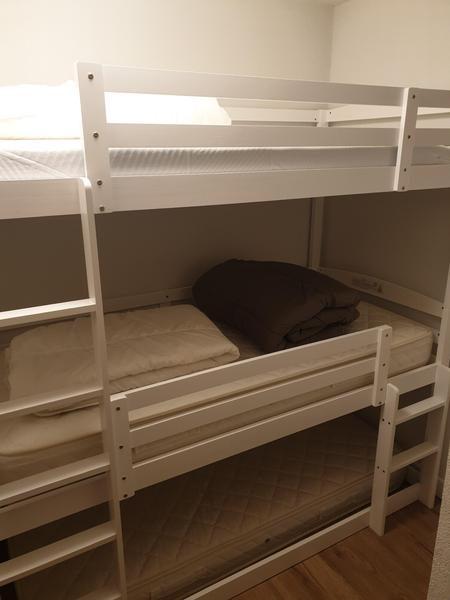 Appartement aménagé pour 5 personnes, avec trois lits superposés et un canapé-lit confortable. Un casier à skis est à disposition et le stationnement est gratuit devant la résidence.
