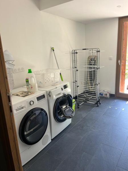 Au rez de jardin, accessible par le chemin piétonnier, vous trouverez une buanderie avec un lave-linge, un sèche-linge et des étendoirs. Une porte extérieure vous permettra d’accéder directement à ce niveau pour les retours de ski ou de randonnées. Vous pourrez y stocker vos équipements de ski et/ou de vélos.