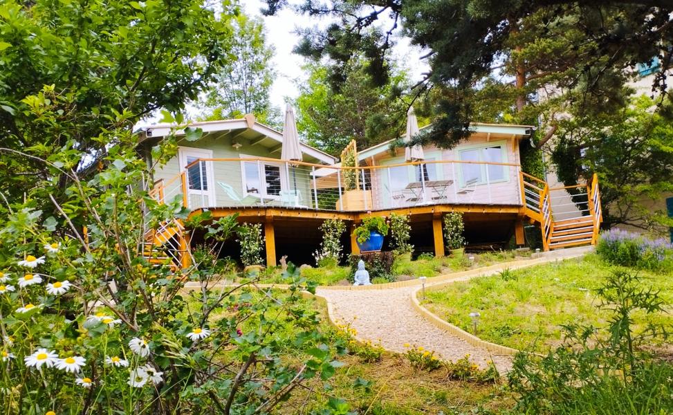 Nathalia et Thierry vous accueillent aux chalets perchés en pleine montagne, dans leur grand jardin arboré à proximité de leur logement, du potager et du poulailler.
