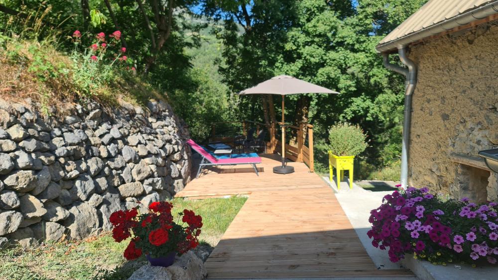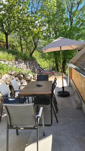 - vastes terrasses privatives de 40 m2 et petit coin de pelouse privatif avec parasols transats, salon de jardin, table et chaises de jardin, plancha, barbecue, à l'orée de la forêt et avec vue sur le lac de Serre-Ponçon et les montagnes.