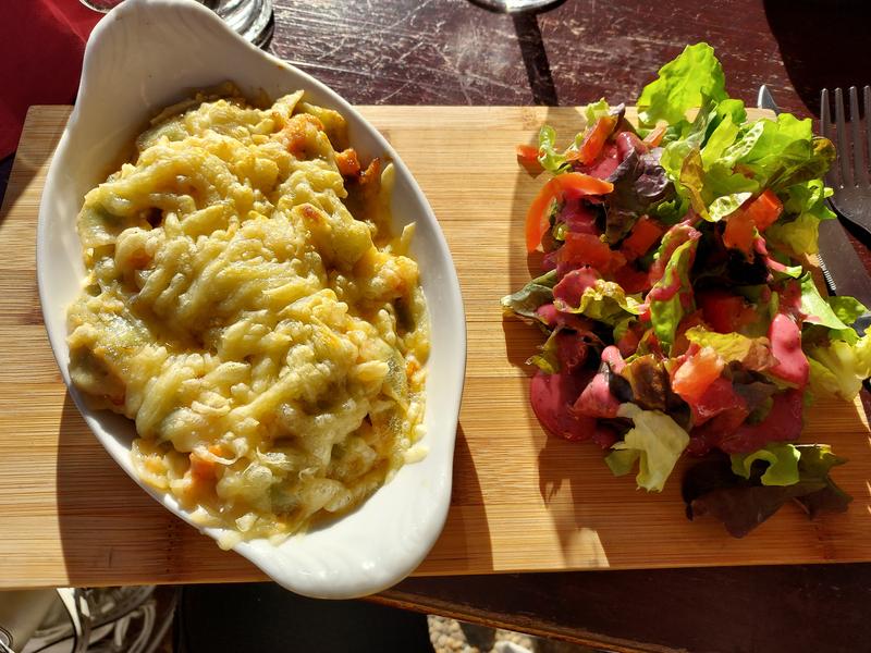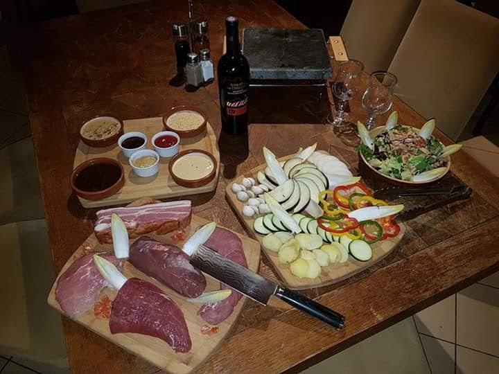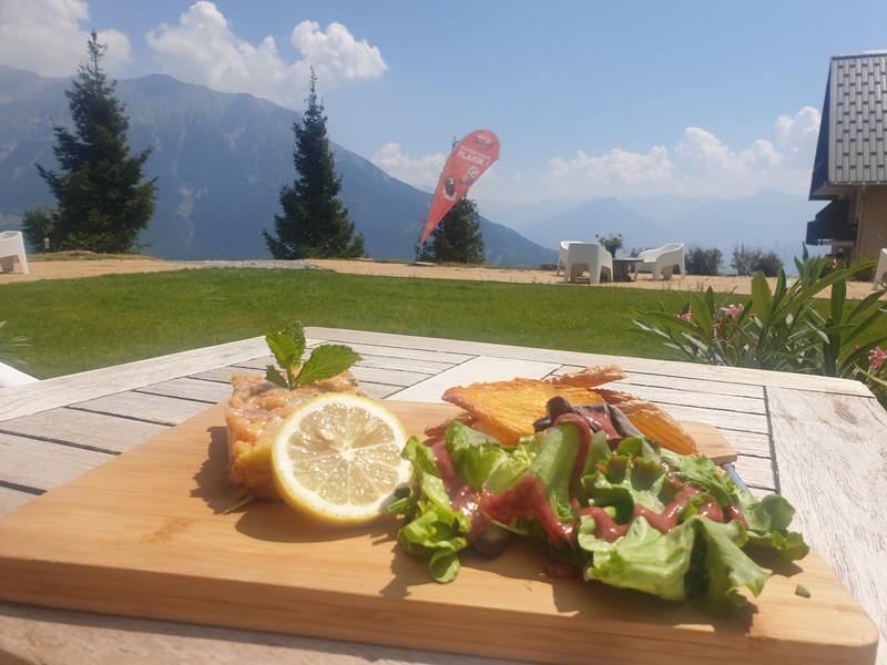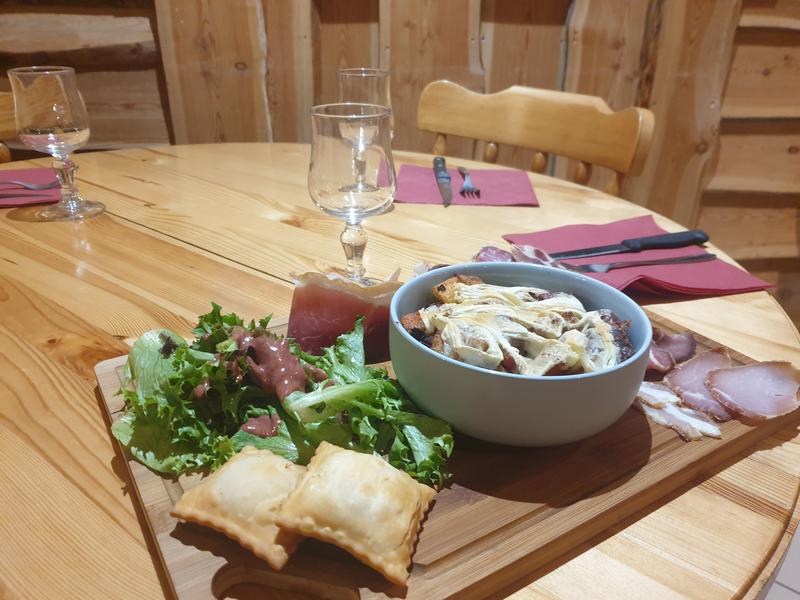 Cuisine traditionnelle et authentique : fondues et raclettes râpées sur meules, pierrades atypiques, épaule d'agneau de pays cuite sept heures et potence de charcuterie artisanale pour la saison hivernale. Pour l'été, des salades, des grillades de viandes locales ainsi que des plats cuisinés... Le tout dans un décor en bois.