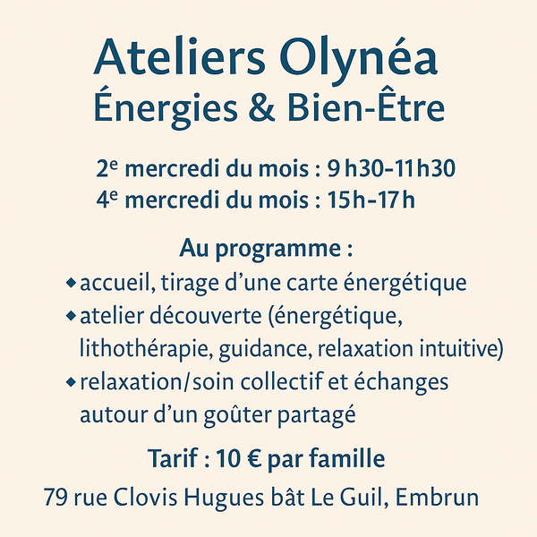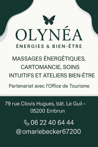 Situé à Embrun, Olynéa Énergies & Bien-Être vous invite à vivre une expérience de recentrage et de sérénité : soins énergétiques, guidance intuitive, lithothérapie et beauté naturelle Farmasi.