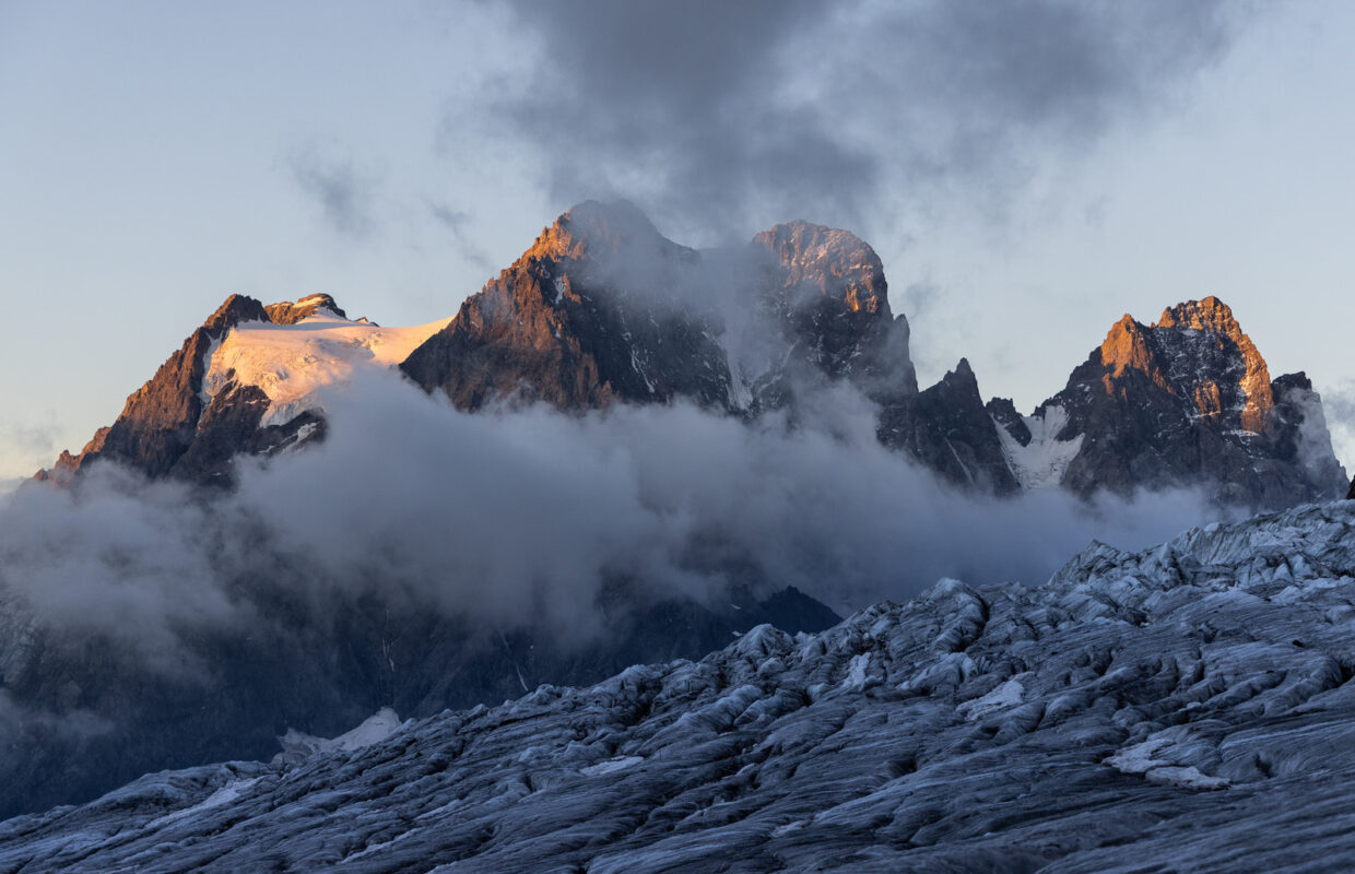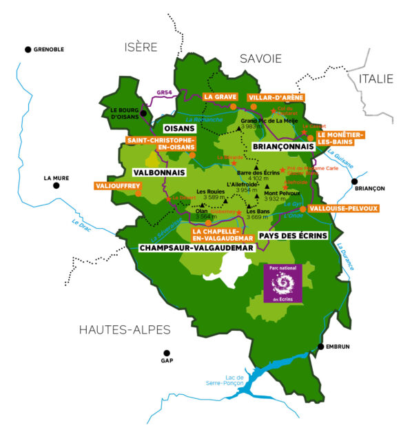 La Grave, Villar-d’Arène, Le Monêtier-les-Bains, Vallouise-Pelvoux, La Chapelle-en-Valgaudemar, Saint-Christophe-en-Oisans et Valjouffrey. Tout commence et tout finit ici : les courses d’alpinisme vers le Grand Pic de la Meije, l’Olan ou les Aiguilles de la Bérarde, l’itinérance du Grand Tour des Écrins par le GR54, l’escalade sur les falaises d’Ailefroide, les randonnées vers l’un des trente refuges du massif comme le fameux refuge de l’Aigle, les balades en famille à destination du Voile de la mariée au Gioberney ou du Pré de Madame Carle à Ailefroide, le spectacle des glaciers et des lacs d’altitude. Sept villages d’alpinisme dans les Écrins, autant de camps de base au sein du parc national éponyme. Des villages où bat le cœur d’hommes et de femmes de passion, les gardiens de refuges, les guides de haute montagne, les gardes, les scientifiques du parc pour qui le partage et la solidarité sont le reflet de l’identité et des traditions montagnardes. Des lieux de transmission où vit la culture de l’alpinisme depuis des générations.