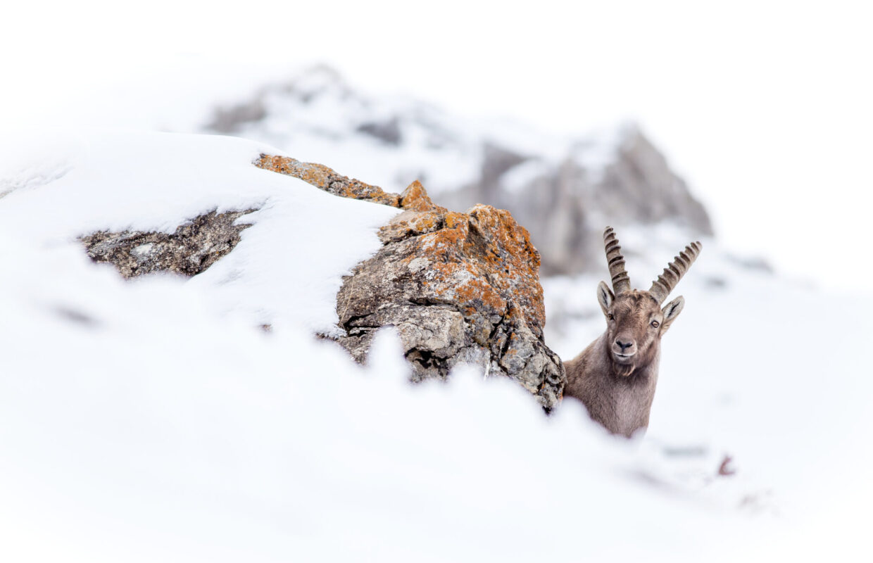 Uno stambecco si riscalda al sole dopo un rigido inverno