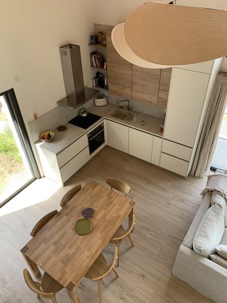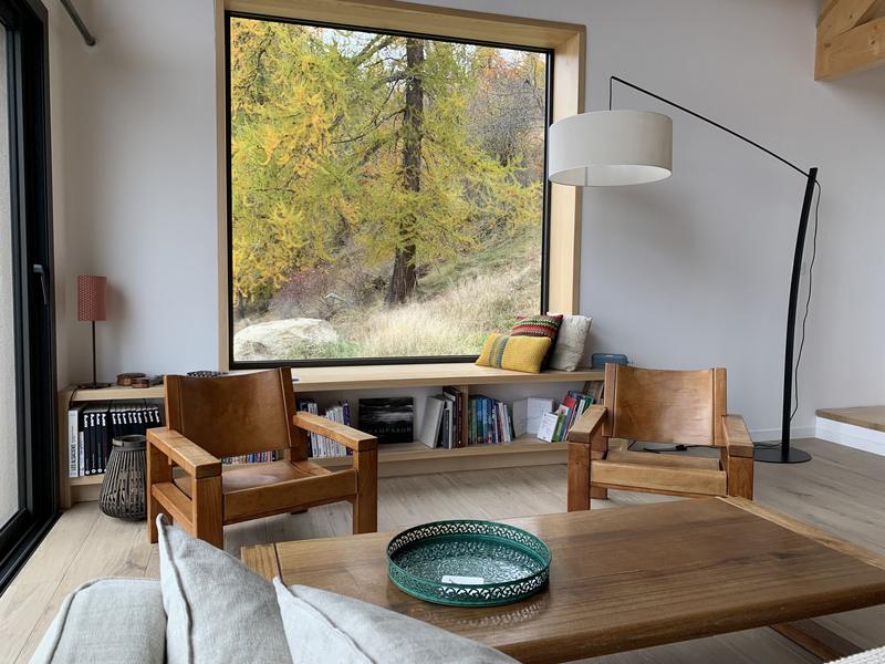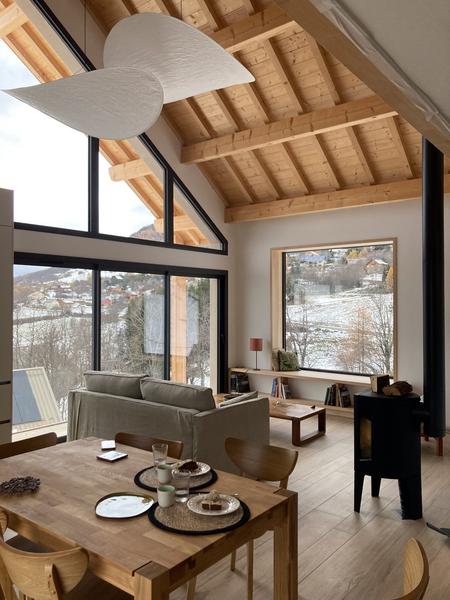 Le chalet offre un intérieur épuré et chaleureux, ouvert sur le paysage. La pièce principale, sous charpente apparente, regroupe une cuisine équipée, un coin repas, un salon avec poêle à bois et une banquette de lecture face aux mélèzes. Une haute baie vitrée prolonge l’espace vers le massif du Dévoluy.