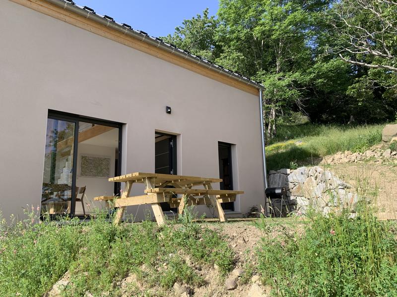 Extérieur : balcon, terrasse avec table de pique-nique, barbecue, chaises longues et hamacs entre les arbres.