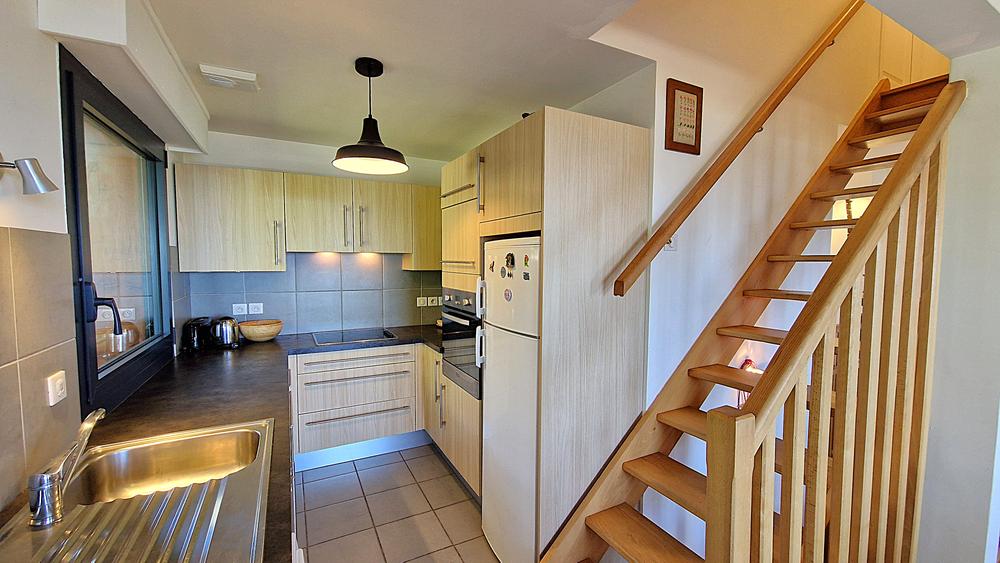 - Un coin cuisine équipé ouvert sur le séjour (plaques cuisson, cafetières Nespresso et filtre, four, micro-onde, lave-vaisselle,réfrigérateur/congélateur).