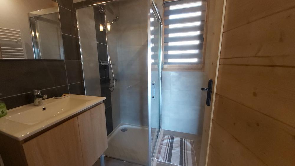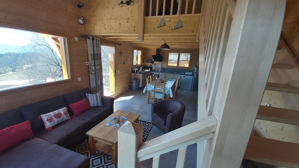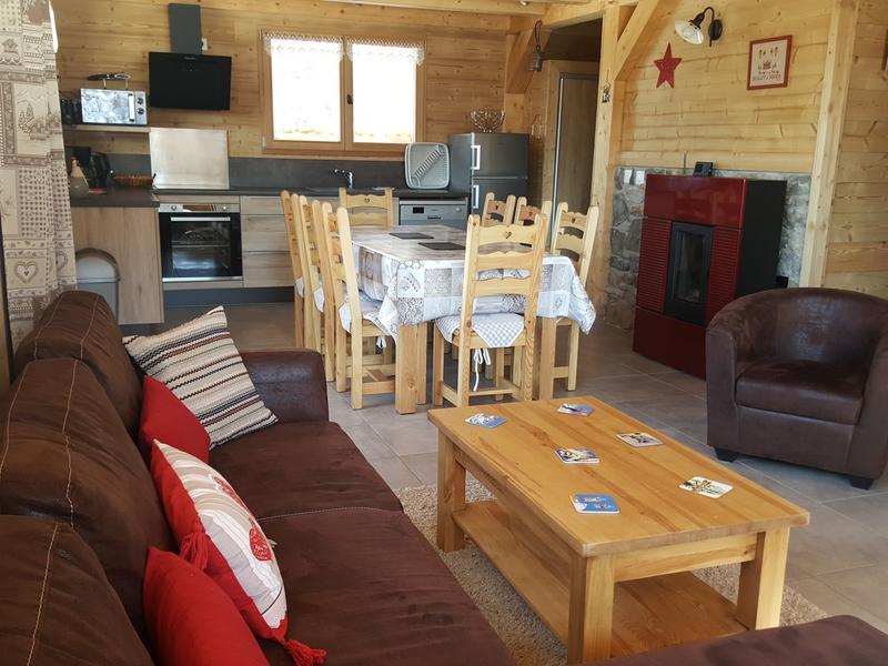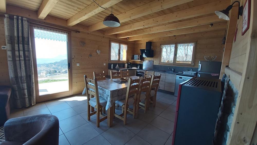 Entrée de plain pied par l'arrière du chalet dans la grande pièce à vivre, grandes baies vitrées sur une partie de la pièce. Un poele à gramules. Coin cuisine aménagée, séjour et salon.