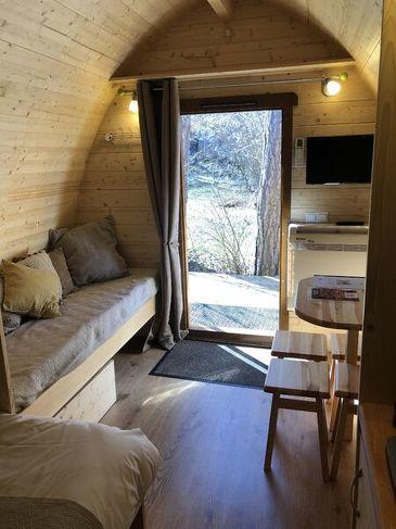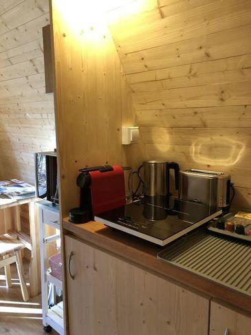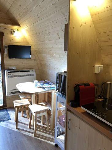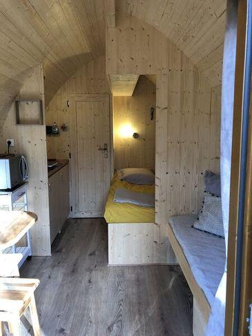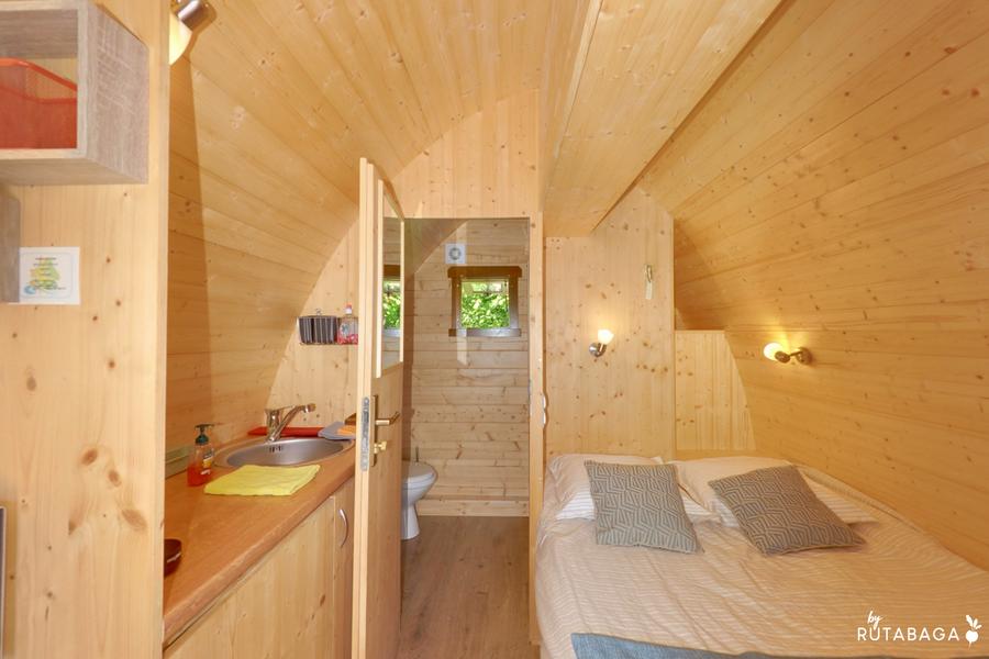 De Cabane, POD, heeft 3 bedden (1 tweepersoonsbed 140 x 200, 1 bed 80 x 190) in een ruimte van 13 m², een kitchenette met koelkast, inductiekookplaat en een eigen badkamer (douche, wastafel, wc).